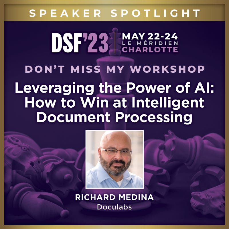 Our co-founder and all-around intelligent automation (and more) expert, Richard Medina, will be speaking as well as running a workshop. The workshop is titled, Leveraging the Power of AI: How to Win at Intelligent Document Processing. You can join him at the event by using his VIP registration link: https://bit.ly/DSF23SPEAKERVIP #DSF23Charlotte.